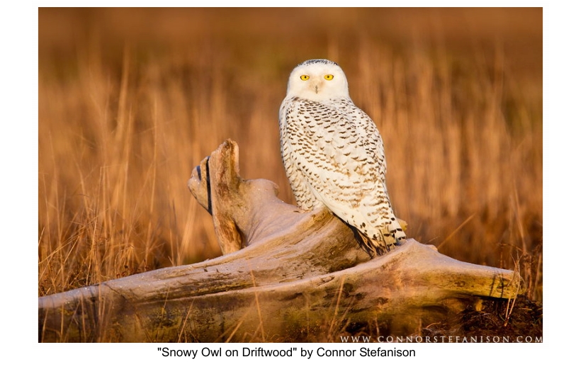 Looking at Connor Stefanison’s photograph titled Snowy Owl on Driftwood I am engulfed in a calm and silent amber world, pierced only by the yellow eyes of this fierce and majestic bird. The light indicates a setting sun, the grasses that surround the bird have dried in the cool November air. The Snowy Owl waits on its perch for small animals to offer themselves up for supper.