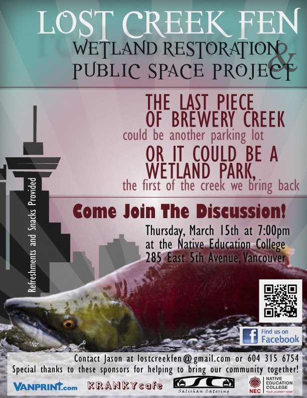 It has long been an interest of mine as a wetland steward to participate in the project of an urban wetland. While the city isn’t the most important space for wildlife habitat, it does provide many great learning opportunities for a very broad audience. On March 15th, I had the opportunity to sit in on a visioning meeting for such a project: that of the Lost Creek Fen in the Mount Pleasant neighbourhood of Vancouver.