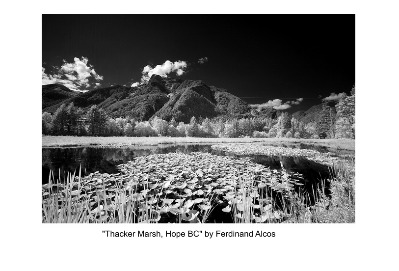 It is world water week, and in honour of this we have selected a photograph that represents the type of wetland western Canadians are most often familiar with. The infrared photograph of Thacker Marsh is a crisp and radiant example of the watery beauty at the confluence of the Fraser and the Coquihalla rivers. Marshes can often be found attached to rivers and open waters, and act as a transition between aquatic and terrestrial environments. Our selected photographer, Ferdinand Alcos, has made the connectivity of the earth, atmosphere and these vast aquatic systems very apparent in his vision of the marsh. This is one of the most productive forms of wetlands: high in nutrients, these ecosystems attract a wide variety of animals. Insects come to feed on the emergent vegetation and plankton, and the insects, in turn, draw a complex food chain of migrating birds and mammals.