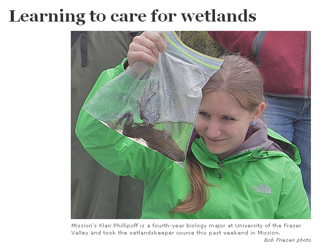 The Fraser Valley Watersheds Coalition (FVWC) and B.C. Wildlife Federation co-hosted the wetland keepers course April 13-15 in Mission, which drew community members, naturalists, public service employees and professors, among others. All the participants learned how to classify wetlands and appreciate their intrinsic values, as well as identify competing land-use needs and how to monitor the areas through vegetation and amphibian surveys.
