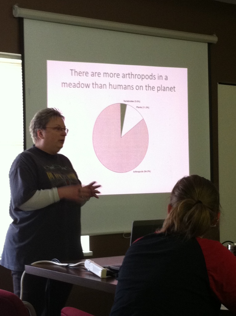 Karen Needham, curator at the Spencer Entomological Museum and lecturer to the department of Zoology at the University of British Columbia, started off the workshop with an engaging presentation on the different types of aquatic insects that might be found in our region. I can safely say that her talk could make nearly anyone want to change professions (and become an entomologist!). Karen’s use of such fun descriptors as Dragonfly “wheels of love” and their competitive “sperm scooping”, as well as explanations of the 90 minute lifespan of the Ephemeroptera (Mayfly), the magical casings created by Caddisflies, and the shiny air bubble carried into the depths of a pond by Water Beetles gave each insect real character. We all learned many identification tips, including how to differentiate between immature Damselflies and the similar looking Mayfly (their tails, gills, and swimming style give them away!) and how to define a “true bug” (Hemiptera have a hardened half to their front wing, no gills and a piercing & sucking mouth part). Karen brought some cases of aquatic insects with her from the museum with specimens for us to see up close during our break.