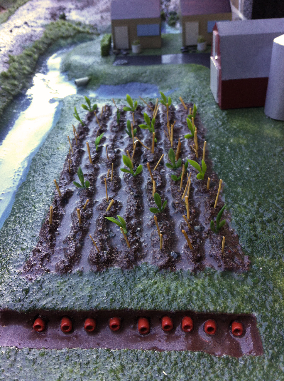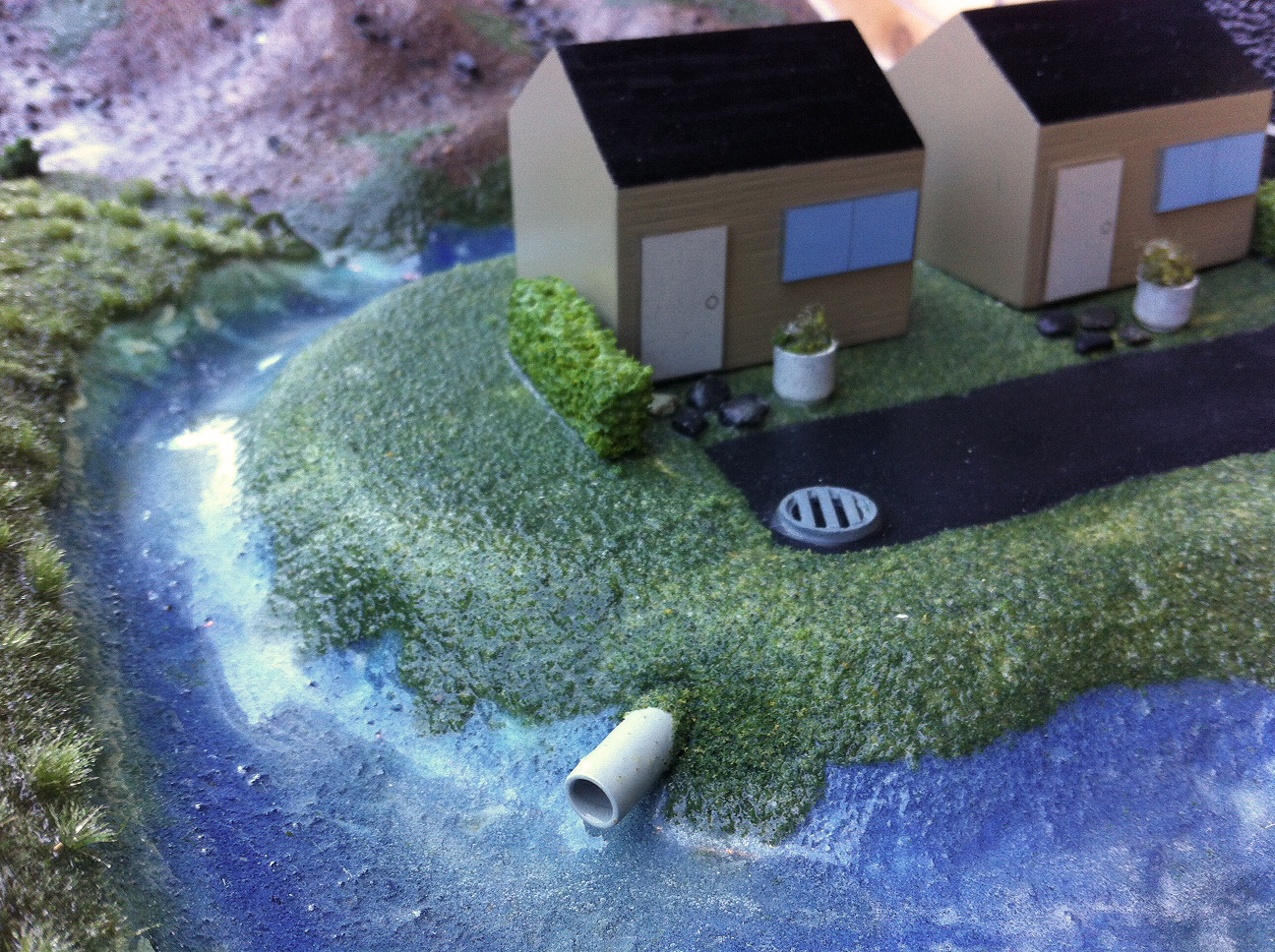 The left side of the model features healthy open water wetlands in the alpine, meandering streams lined with marshes, and an estuary complete with eelgrass. The right side is disturbed and degraded by improper use of the watershed: drainage tiles empty wetlands for farm fields, runoff from pavement leaks into streams, and industry has taken the place of the eelgrass beds. When water is poured onto the model from above, children can compare the speed at which the water flows before it drains out from the sea level through a drain the designers build in.