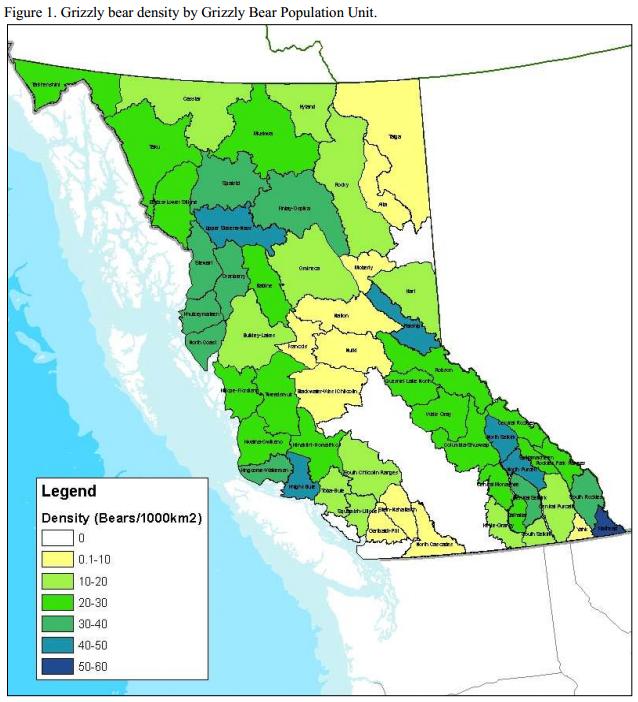 Grizzlies are found throughout northwestern North America and may have a home range of upwards of 800 km2. The large range is indicative of the potential for human-bear conflict. Relying most heavily on their sense of smell for finding food, “problem bears” occur where home range overlaps with urbanised areas. Interestingly, majority of a Grizzly bear’s diet comes from vegetation. This includes tender grasses, herbaceous plants, roots, and berries. However, all bears are opportunistic omnivores and also feed on insects, salmon, juvenile mammals, weakened large mammals, carrion, and even other bears. In the coastal regions of BC, Grizzlies feed mostly in estuaries and valley bottom wetlands.
