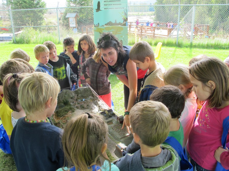 The surrounding mountains in the North Thompson Watershed made it easy for the students to visualize a watershed as a ‘big bowl’ collecting water. We came equipped with our watershed model which consists of a natural watershed filled with wetlands and the elements of a typical development in a watershed. Students could see first hand how developing wetlands influences the flow of water in the watershed through a number of exercises.