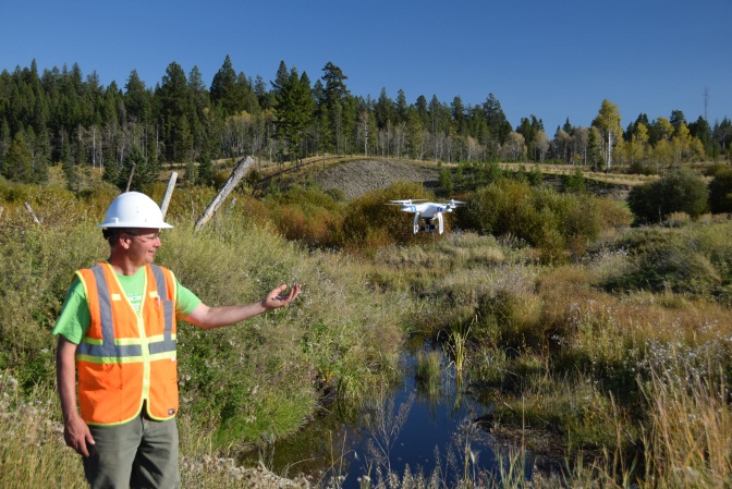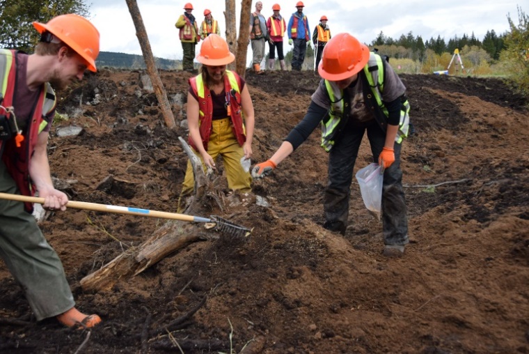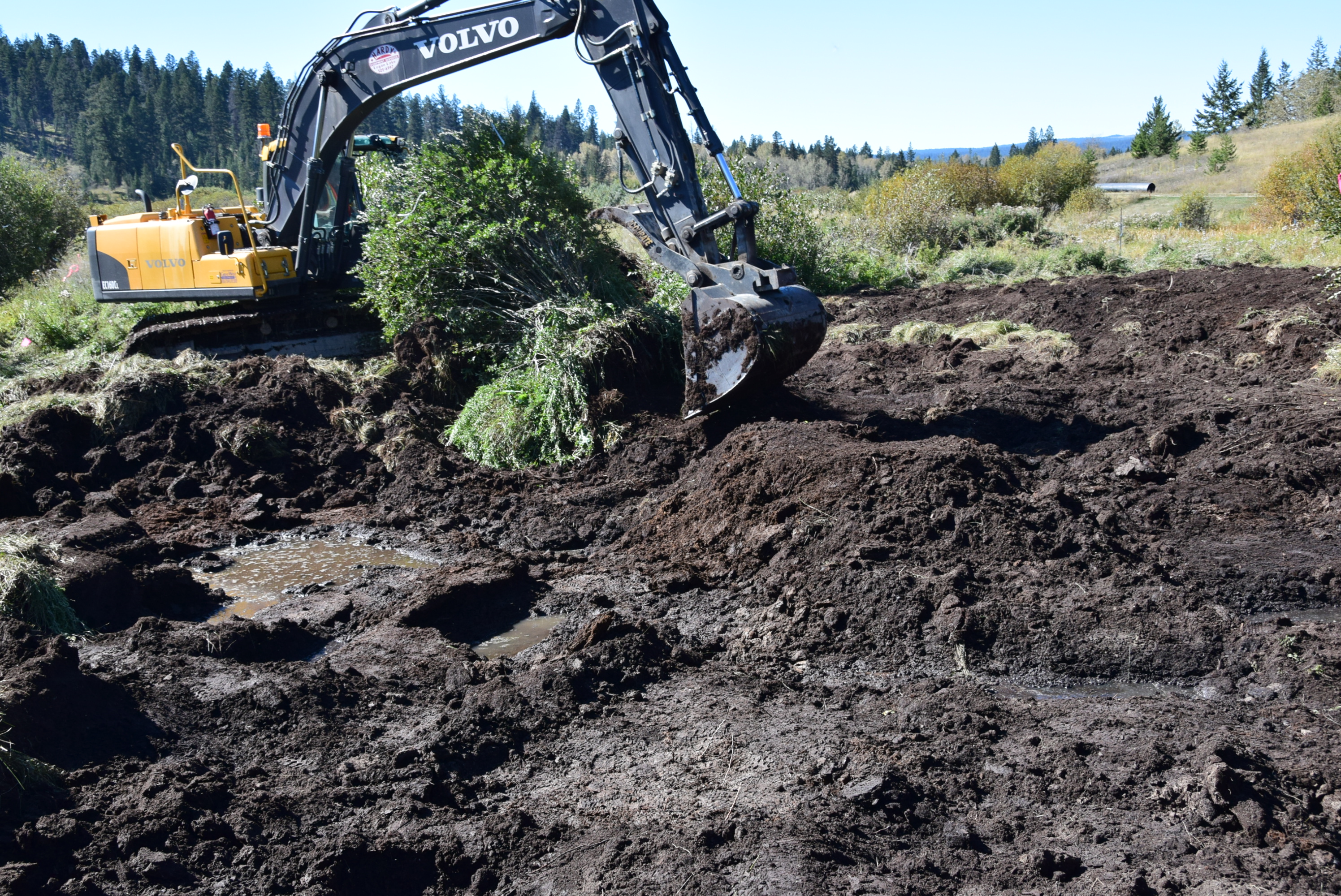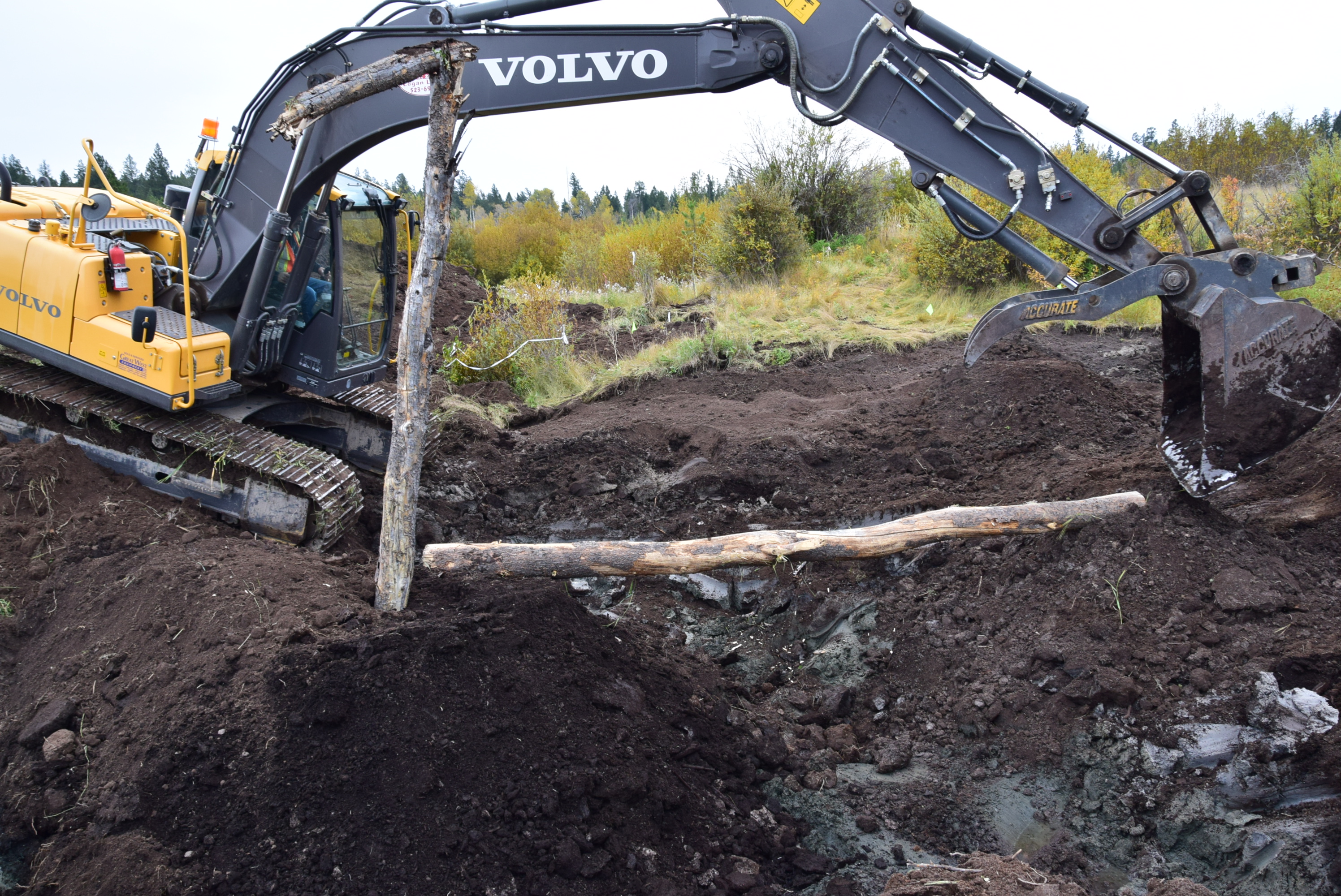 In September 2014, with generous funding by the Habitat Conservation Trust Foundation (HCTF), we worked in roughly the same area as we did in 2013, upstream of Logan Lake. The plan was to create a larger wetland complex with 3 basins (see Before & After photos above). Tom led us through a full day flagging the area, surveying elevations, digging soil pits and going through the logistics of the site. Monday morning arrived with the excavator on site and us anxious to see what it would encounter. Tom explained to Shane, the operator, what he wanted done. He then explained the workings to the group which led to questions and feedback, which in turn tweaked the plan for Shane. This occurred throughout most of the day.