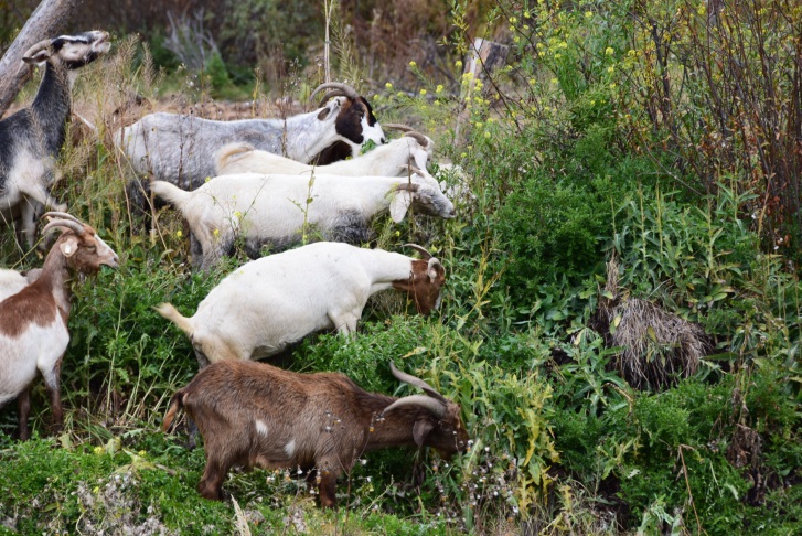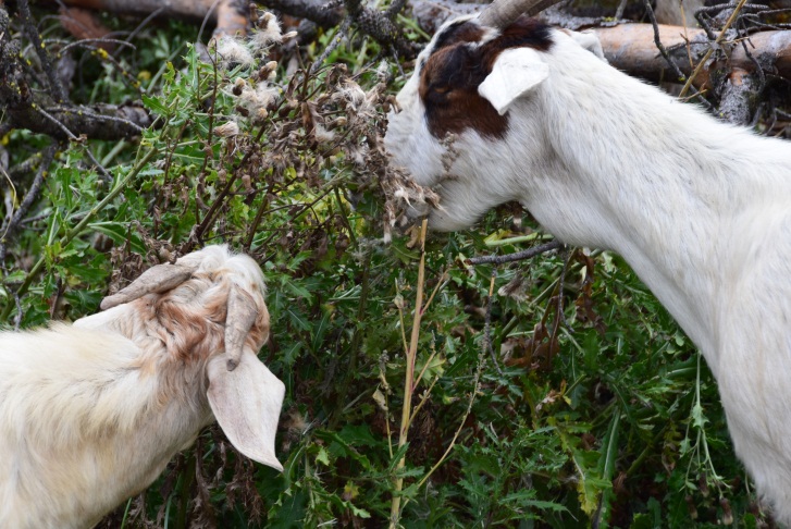 Constructing a project on a golf course has a downside; unless you are staff or a golfer access is restricted due to flying golf balls and liability issues. We made arrangements for Thursday afternoon, a timeslot when the course could be cleared, to invite the public and also bring a herd of goats onsite. We were anxious to have an opportunity for the local residents and others to see what we were doing and the goats just added to the educational factor. Rocky Ridge Vegetation Control, a BC company that raises and uses goats for weed control, was working in the Logan Lake area. We made arrangements for them to graze on the upland around our 2011 and 2013 wetlands. This experiment took place as the area has a lot of invasive plants, especially Canada thistle, due to the removal of organic soil from the natural wetlands 28 years ago and our opening up of the seedbank with wetland restoration projects. We have tried various methods of environmentally friendly invasive plant control in an attempt to stay away from herbicides and this was the next step. Goats are utilized for weed control as they are one of only a few animals that loves to eat weeds and the fact that they have a complete digestive system means the seeds they eat are not viable in their manure. Two riders on horseback with 5 dogs moved 248 goats to the site. It was quite interesting for the students and the public to watch! When all was said and done at the end of the day we had a chance to assess the results. We quickly realized that there were too many goats for the small site with more vegetation trampling than eating. The goats were stressed from being pushed and confined as they were not allowed to wander at will. They certainly did eat thistle but also the willow and our nursery plants. A nice try but not quite the results we were hoping for.