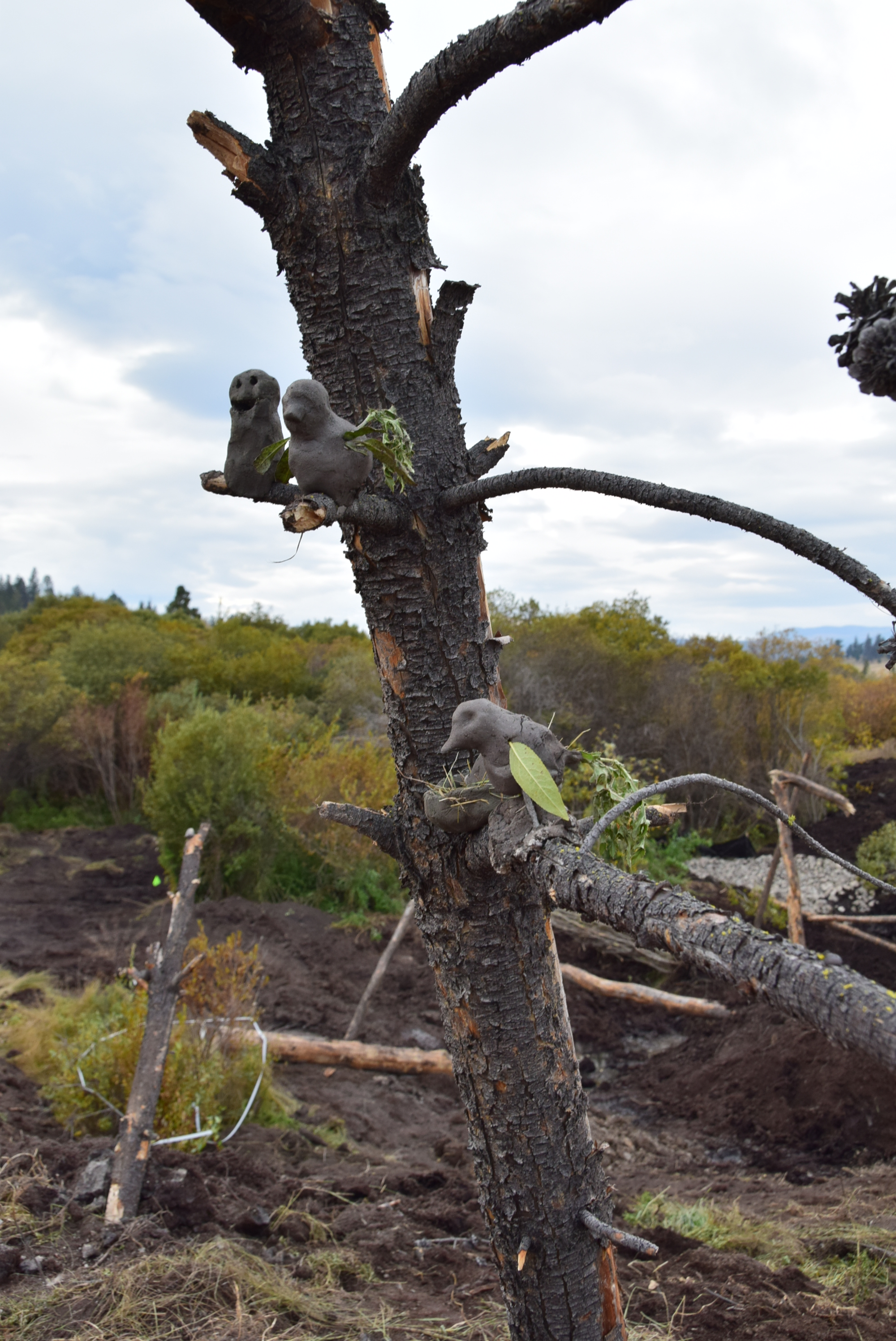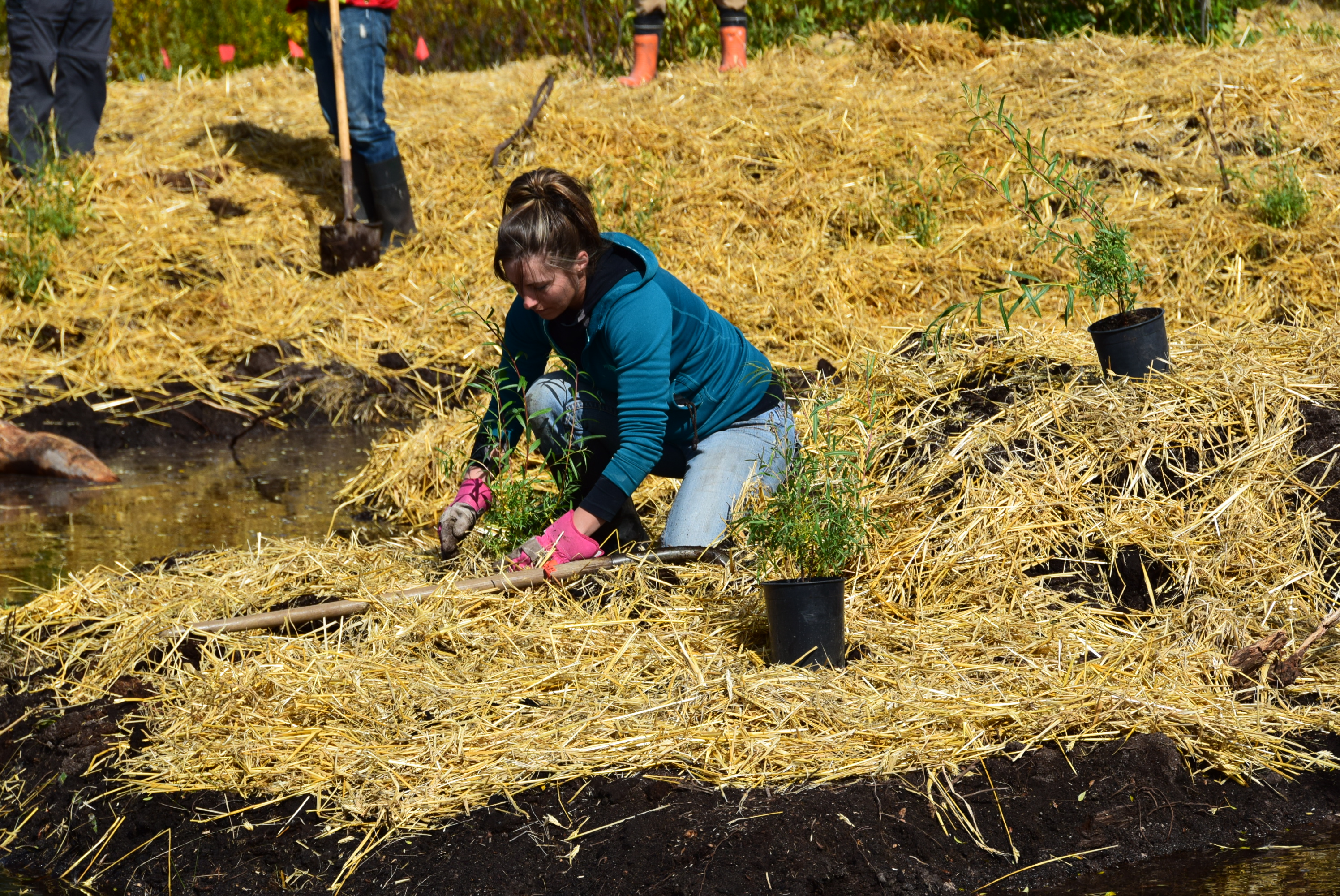 As this part of the project was going more smoothly and quickly than expected we decided to ramp up the outdoor classroom value – divide the class into 3 groups and have them plan and design their own separate wetlands downstream. Nervousness gave way to excited planning chatter, surveying, flagging and digging soil pots as each group immersed themselves at their site. Once the excavator work was complete at the larger complex Shane then moved to the first student site. He was a perfect fit for working with an inexperienced group as he was very patient and open to discussing their plans and ideas. Tom, of course, was the overseer posing “what if “ questions to guide them when required. It was amazing to see “light bulb” moments, the group taking ownership of “their” wetland and working together as a team. The second group encountered a great clay layer, perfect for sealing the bottom of their wetland. The third group was getting anxious as time was marching on and we weren’t sure that we would get to “their” wetland with only 4 days of excavator time. Shane worked efficiently and breaks were short. We made it! Each group put their own touch on their site; islands with log bridges, deeper/shallower basins, a snag on a knoll sporting clay wildlife, utilizing native seed that that group harvested locally instead of the commercial seed mixture and of course group photos at “their” wetland. The smiles and high fives were definitely evident and talk about the “best fieldtrip ever” really made the week for instructors and organizers.