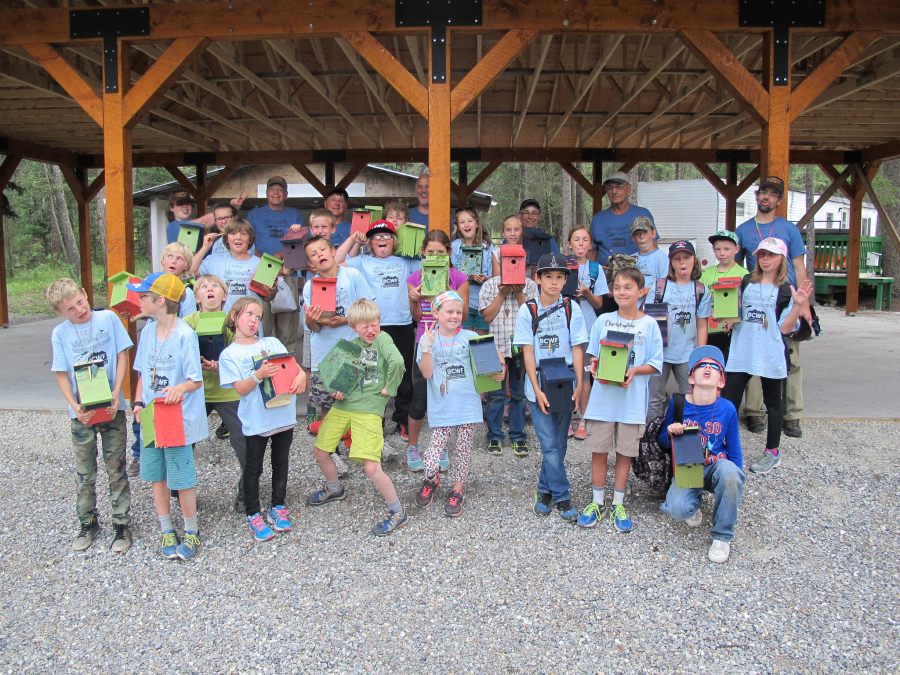 Tuesday was our busiest day! With a full day rotation of archery, air rifles, birdhouse building, and shot guns the kids had a blast. Archery, run by Bob Walker, gave all five kids in each rotation a chance to be shooting the whole time aiming to pop balloons and hit the bullseye. Air Rifles, run by Dan McLaughlin, had our sharp shooters hitting even the smallest balloons. Lunch was a hotdog BBQ generously offered by the Lake Windermere Rod and Gun Club. Neil Fletcher ran the birdhouse building and painting, with the supplies kindly prepared by Lake Windermere Rod and Gun Club. The shot gun station, led by Vic and Darlene Thomas as well as Doug Degrazio, allowed two kids at a time to shoot at clay pigeons with 20 caliber shotguns. Wednesday started with a trip to Kootenay National Park where Sharon Morgan of Parks Canada gave a presentation on the large mammals in the park. With skulls, horns, antlers and furs it was a visually captivating presentation. After a hike through the Redstreak Restoration Trail the campers loaded the bus back up and were off to Columbia River Paddle. Penny Powers rented her canoes out to our group at a discounted rate and the campers spent half the afternoon paddling around the wetlands and the other half fishing on a nearby boat launch.