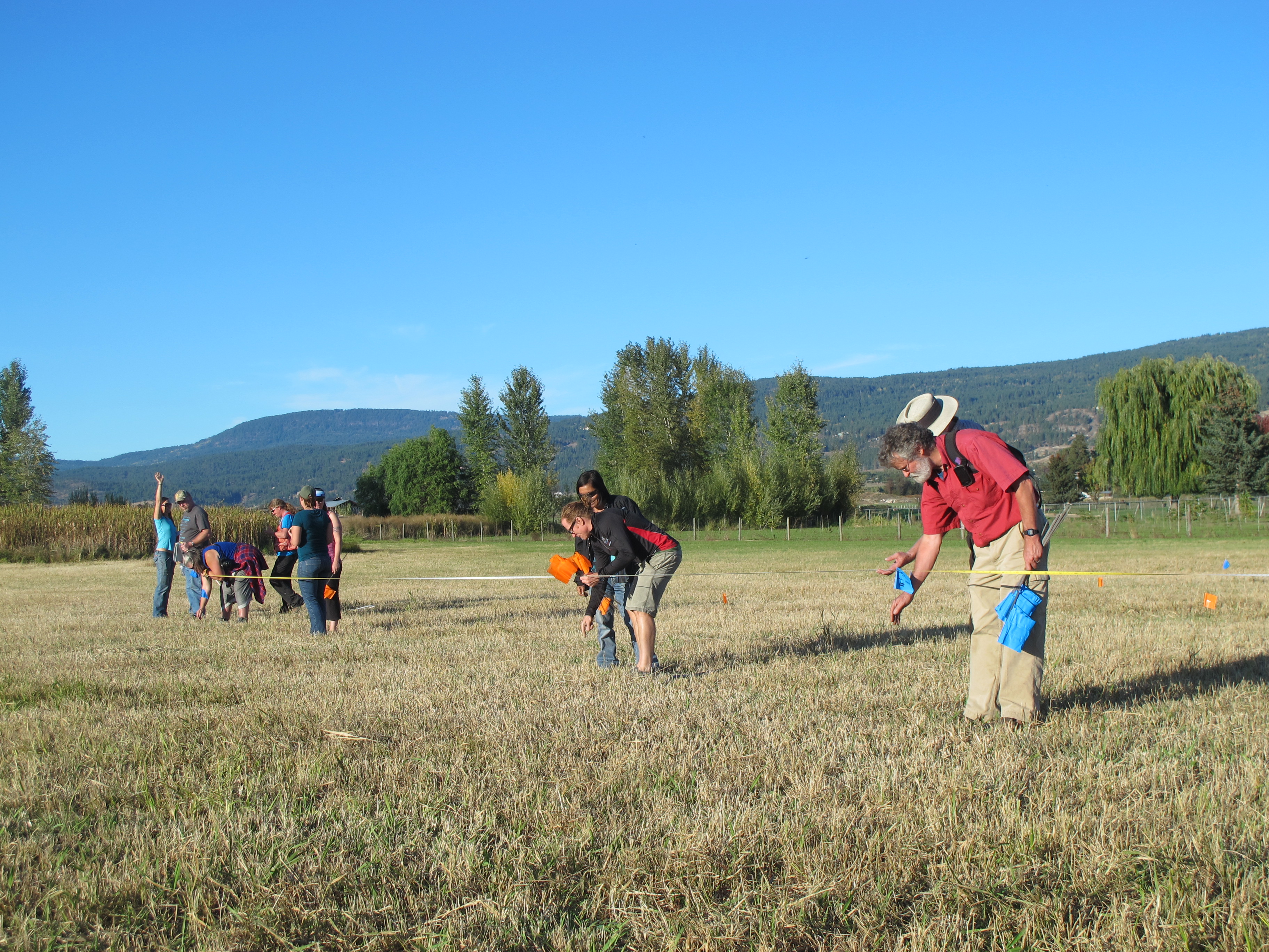 We dove right in on the first day with a presentation on wetland restoration techniques from Tom Biebighauser, a wildlife biologist and wetland ecologist. He covered various strategies for wetland restoration and construction. With this information fresh in mind, we headed over to the Curly Frog Farm in Kelowna to plan a restoration project on site. Flags were laid out marking the boundaries of the wetland areas and the sloped areas where the soil was to be built up creating chinampa-like structures. The “chinampas” (Please click here for a description) will allow property owner, Brenda Dureault, to grow crops on the raised land while having valuable wetland habitat directly adjacent. Here, participants also learned how to use a rod and level to take elevation readings and how to use an auger to take soil samples.