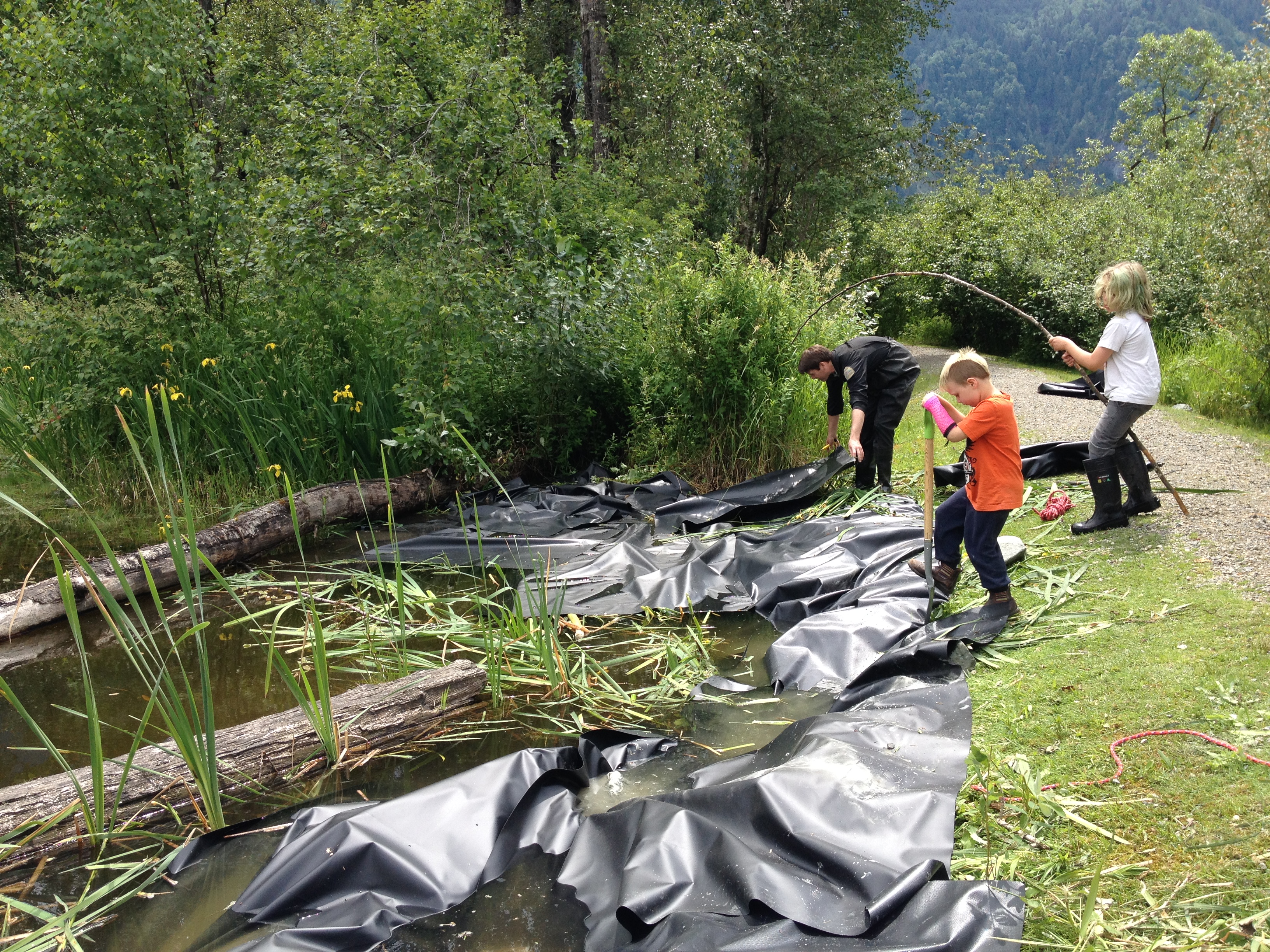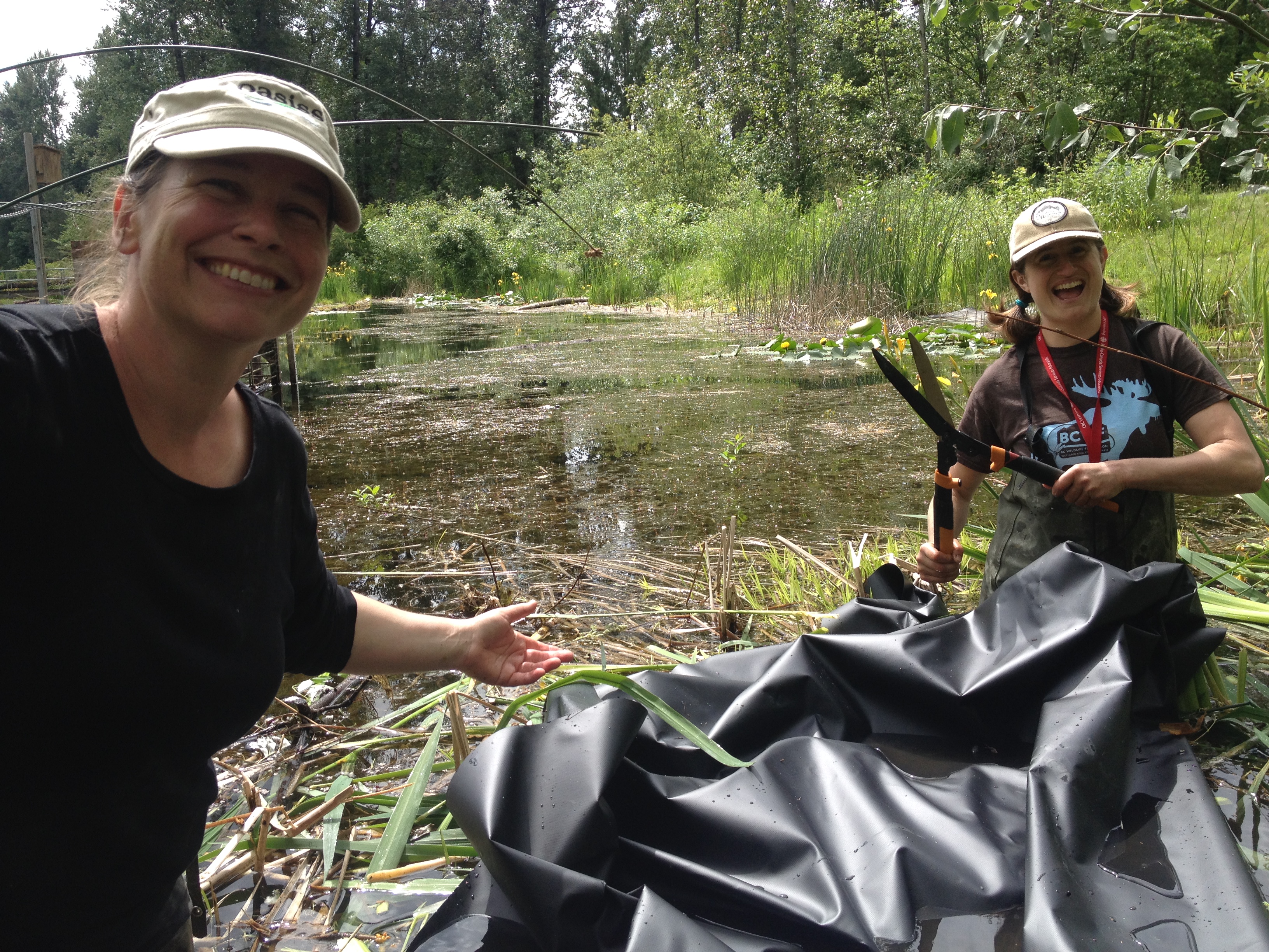 Yellow Flag Iris is an unfortunately beautiful flower that has spread from home gardens to wetlands across the Lower Mainland and Southern BC. The plant creates thick vegetative mats that restrict sediment movement, remove habitat for aquatic organisms, and out compete native vegetation such as broad-leaved cattail. As the prolific species continues to dominate the park, it is clear that something must be done to save our wetlands. This day was in support of Catherine Tarasoff of AgroWest Consulting and Thompson Rivers University, who is conducting research on new methods for controlling Yellow Flag Iris. Catherine and her team are continuing to work on refining the “pond liner method”: by covering the cut rhizomes, they are unable to grow back due to lack of gas exchange. Essentially they “poison” themselves. The liners are then removed and replanted with native species.