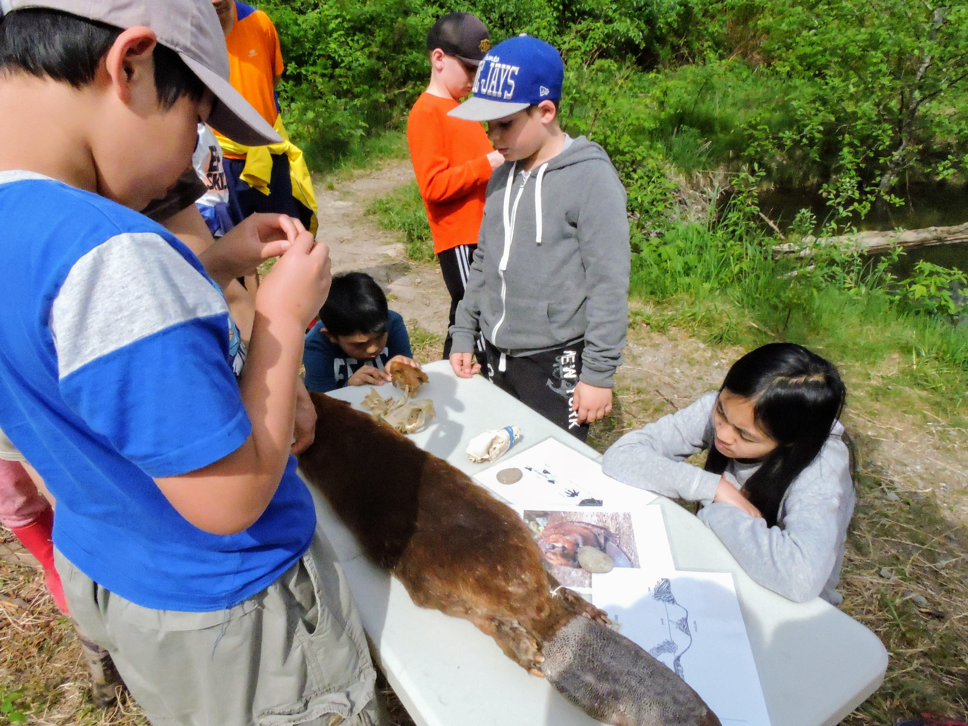 Our station was #3 and it was titled “Beavers – Super Heroes in Fur Pants.” During this station, we taught students about the roles beavers play in the watershed as a “Keystone Species” – a species that other plants and animals greatly depend upon in an environment, where removing them would completely change the area. We spent our time hiking through lush vegetation to an incredible beaver site that perfectly demonstrated the benefits of beavers. It was easy to see many other plants and animals co-existing in the space. It was a truly beautiful site and the children loved being so close to the beaver’s homes (I’m sure the mud was pretty fun to slosh around in as well!). In addition to being able to show the students both a dam and lodge, children learned about the incredible adaptations beavers have to live in water through real beaver artifacts. We even played a bit of dress up to transform unsuspecting students into beavers with silly adaptations from our “tickle trunk”.