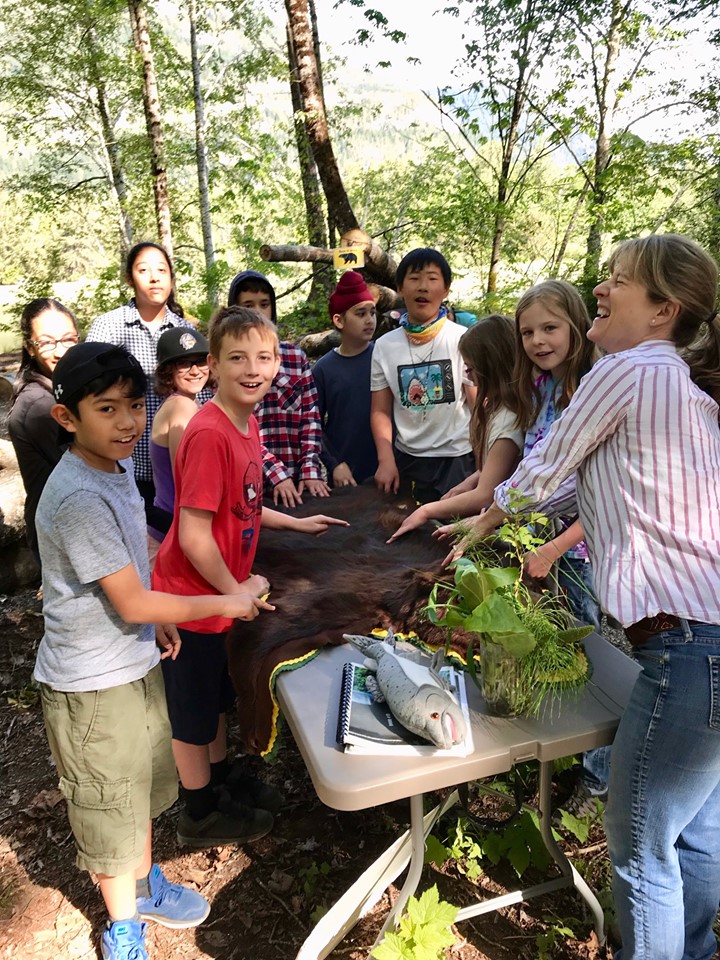 Madyson Adams, Alana Higginson from the Wetlands Education Program (WEP), and Jennifer Rogers from the Youth Program with BC Wildlife Federation helped facilitate the event, along with a number of other volunteers. The event was held in the Squamish Estuary and reached 649 children aged 8 – 12. The SRWS Education Outreach Coordinator, Rhonda O’Grady, developed four stations with the goal of relating the importance of salmon in both a cultural and ecological context. The hope was that each student would leave with an understanding of how salmon, people, forests, and animals are intrinsically connected and dependent on each other. Each station brought this connection to life through hands-on, place-based learning. Students were able to learn the traditional uses of the plants and animals in the Pacific Northwest, play a plant identification game, explore the relationship between bears and salmon, and run through the life-cycle of salmon!