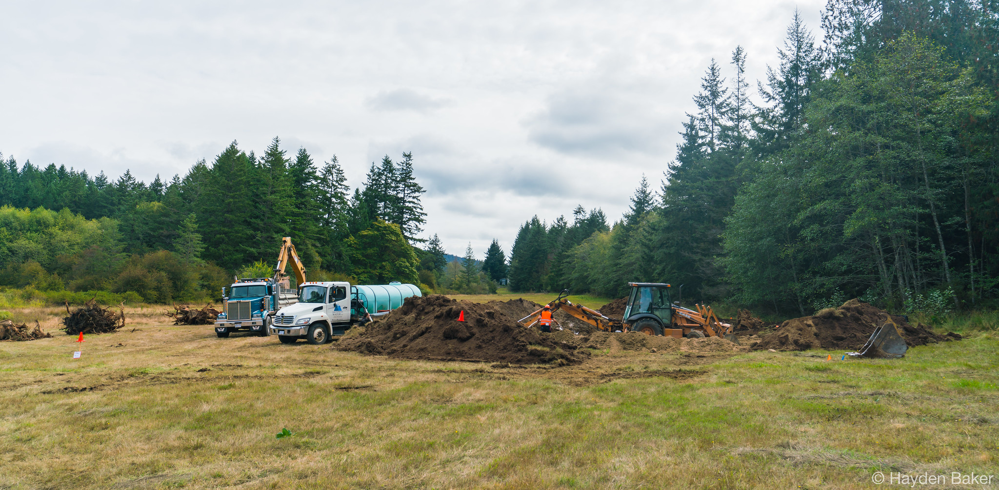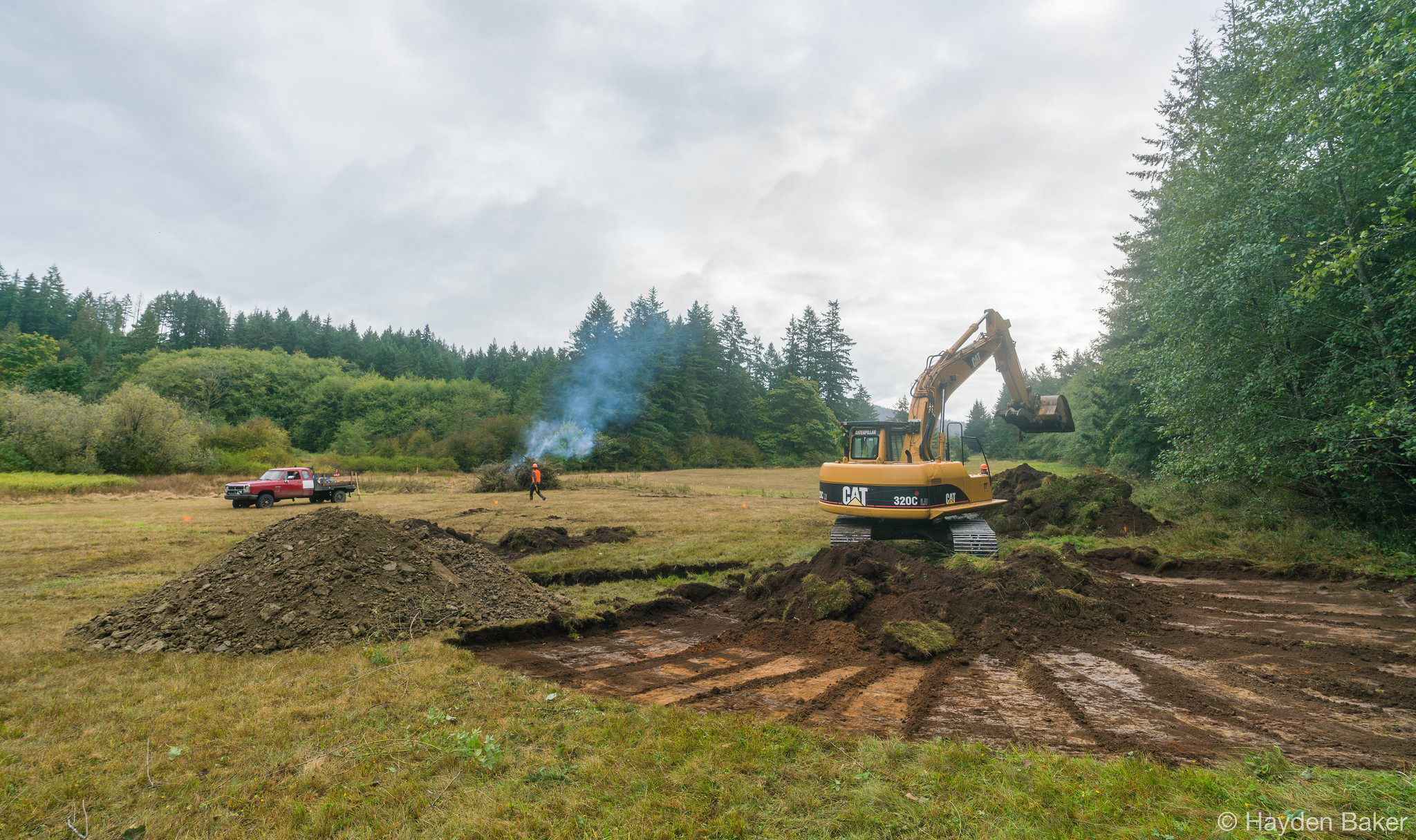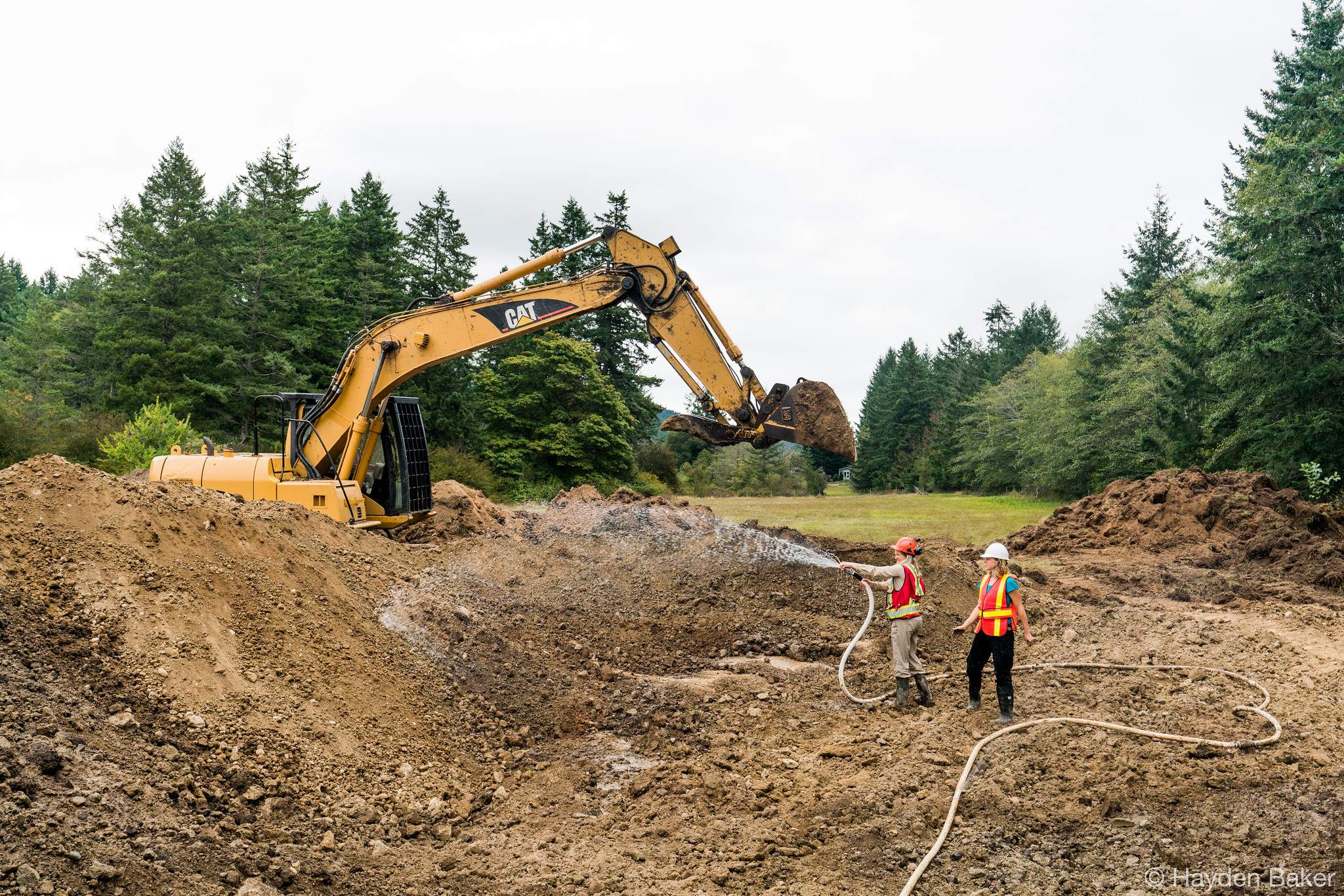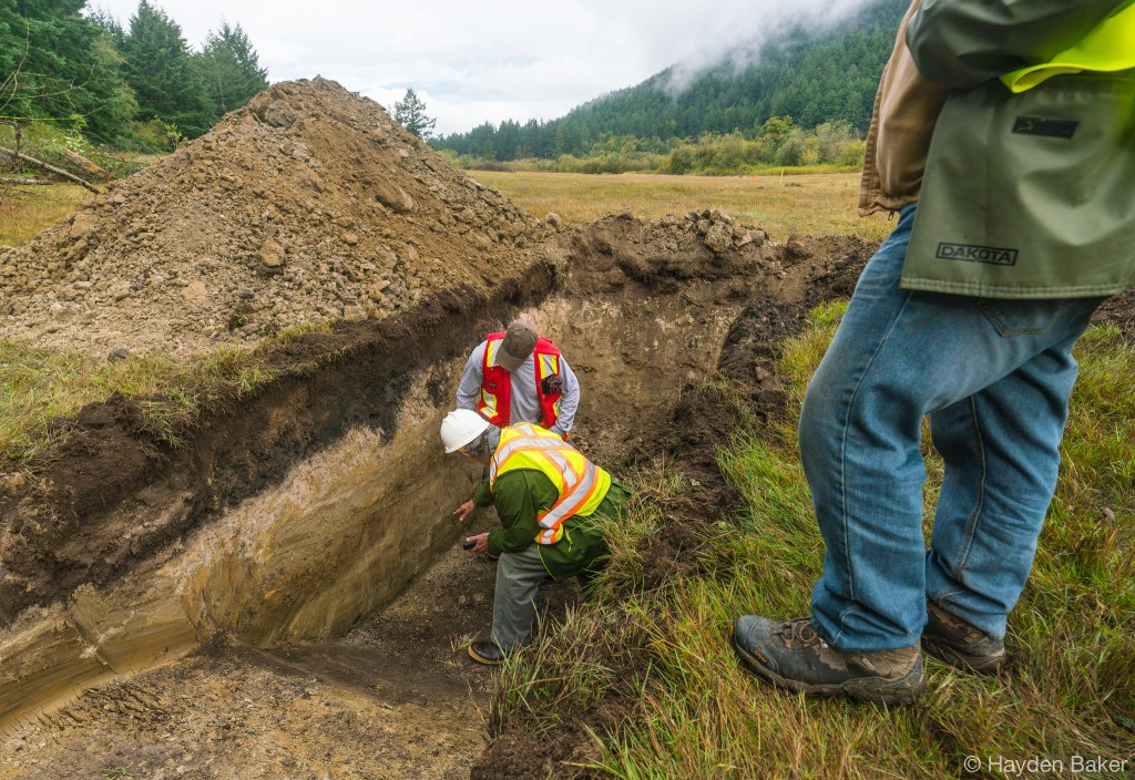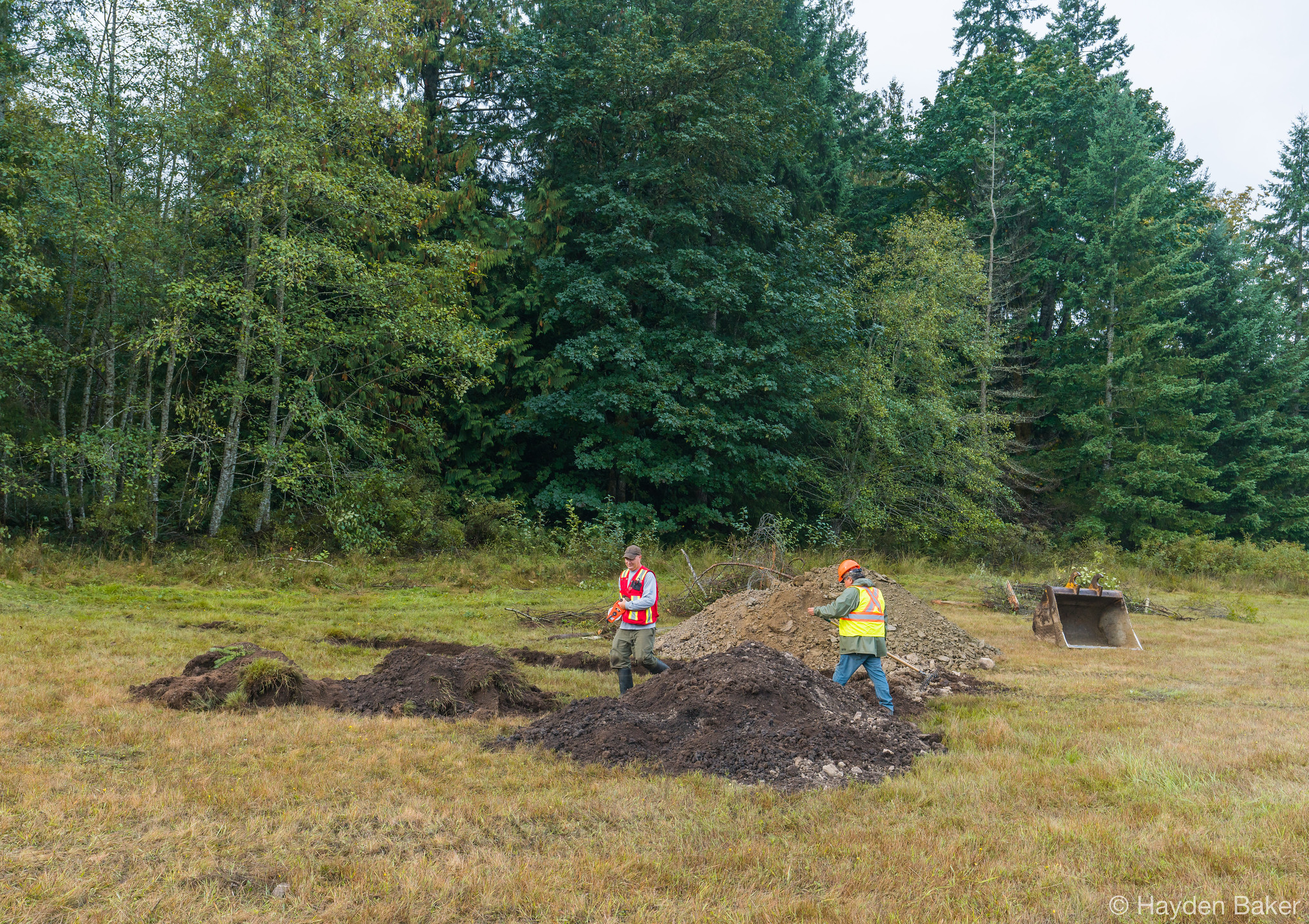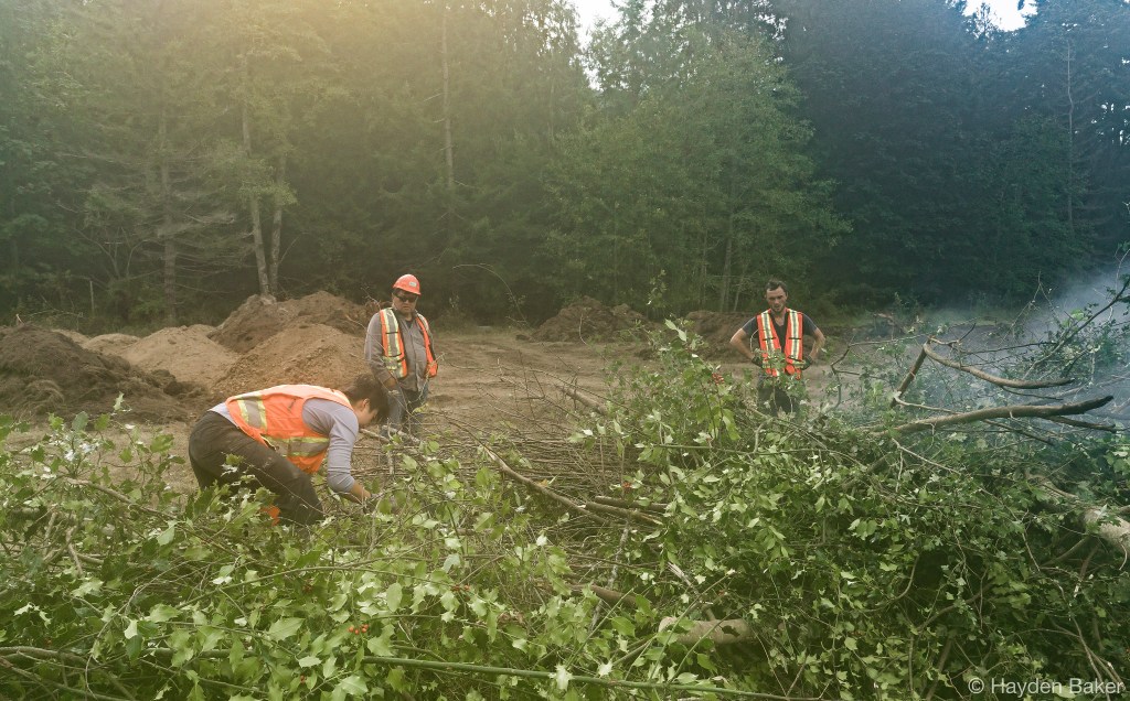 In collaboration with BC Parks and the Cowichan Peoples, the work began with the removal of the fencing along the park boundary, which was heavily guarded by invasive species such as Himalayan blackberry and black hawthorn; both are known to fight back with thorns when being removed. Remove the fencing was necessary to allow the heavy machinery to access the site, and to further assess the soil types present along the park boundary. When restoring a wetland, it is important to identify the composition of the soils to understand how the topography of the subsurface layers changes throughout the restoration area. This helps determine how water will move through the landscape, and how the water table will change throughout the year as precipitation fluctuates. This also provides insights on the placement of future wetlands as phases of the restoration project unfold.