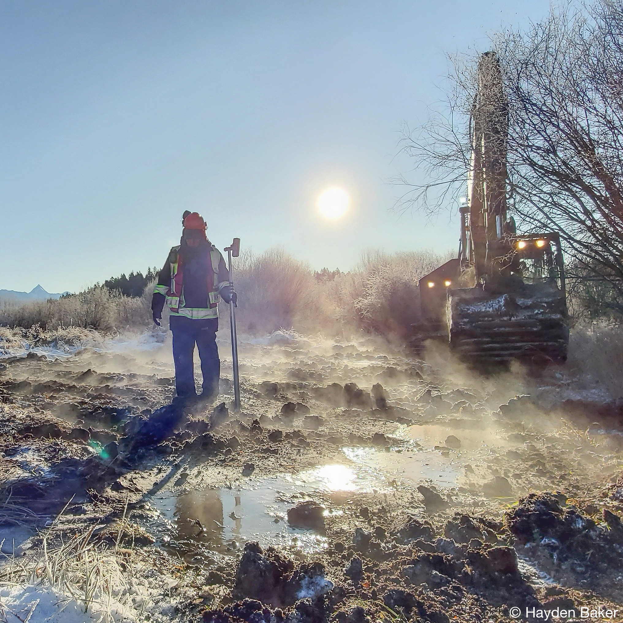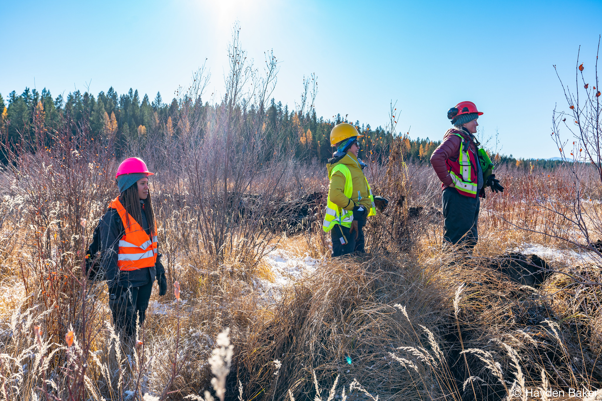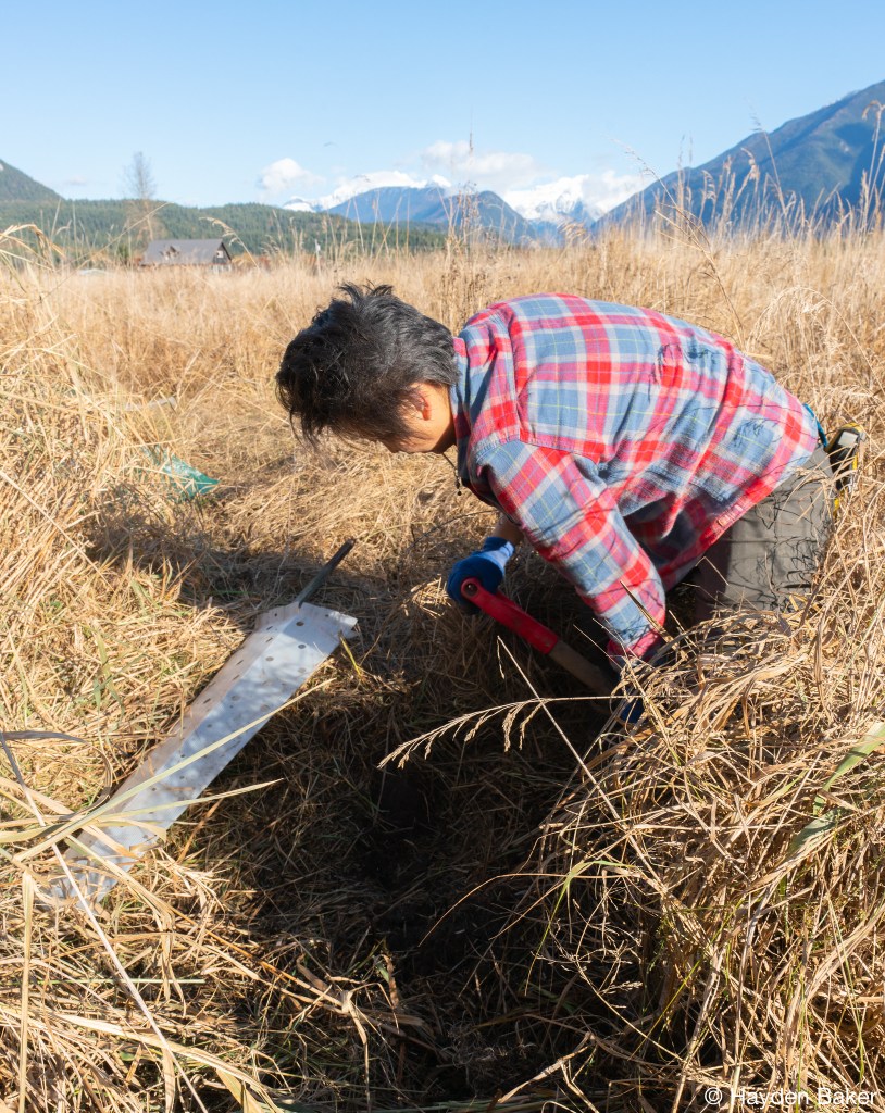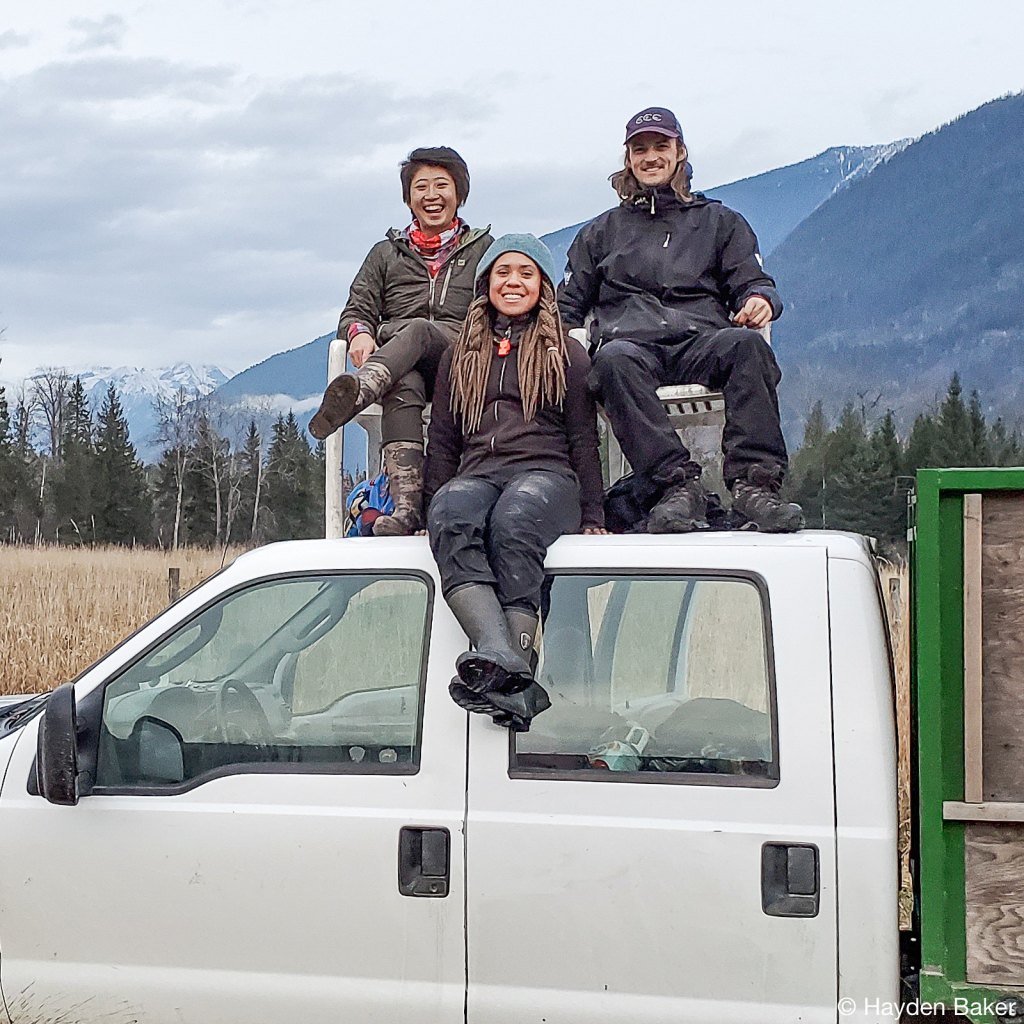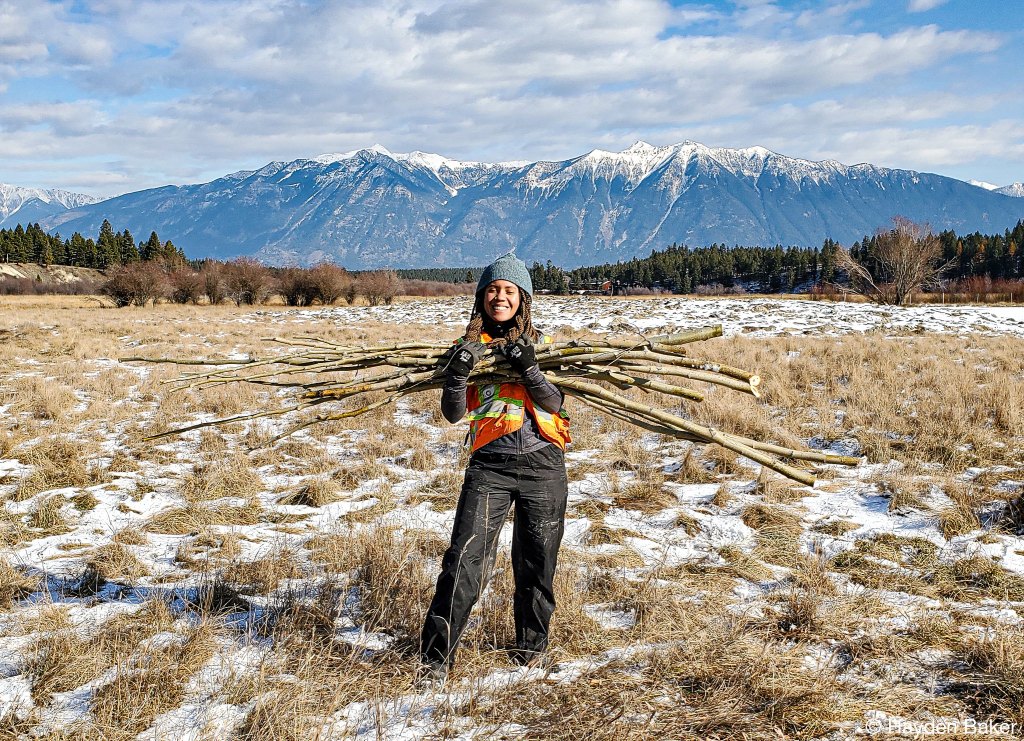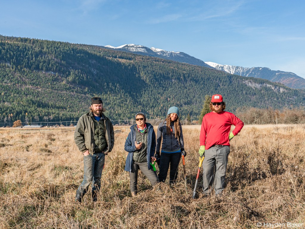 The next stop on this whirlwind tour was Sparrowhawk farm, a scenic private property just outside of Kimberley, B.C. With the beautifully snow-capped Rocky Mountains as our backdrop, we started a 5-day restoration project in what would quickly become frigid winter conditions, with temperatures dipping down to -21°C! This presented us with some unique challenges, which included frozen ground, a near white-out as a short-lived snow system moved through the valley, and one incident where one team member fell through the ice into one of the wetlands. Our team member was okay and he was able to get warm and dry quickly.