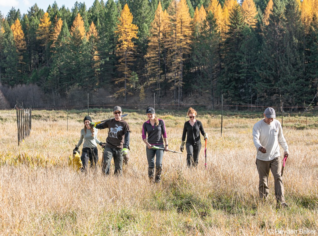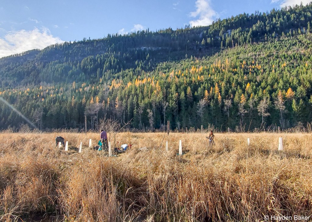 This past autumn, The BC Wildlife Federation (BCWF) had the unique opportunity to provide additional support at two previously restored wetlands, and to assist with the construction of a new wetland complex. On a whirlwind journey of close to 2,500 km, the Wetlands Education Program (WEP) team, along with two volunteer interns from the Canadian Wildlife Federation’s Canadian Conservation Corps (CCC) embarked on a restoration blitz through the Kootenays. Over the course of three weeks, the WEP team planted over 3,500 shrubs and juvenile trees, with the express goal of enhancing habitat for wildlife. This work was completed at the tail-end of the field season, and it was a race against time to complete the work before the winter weather set-in.
