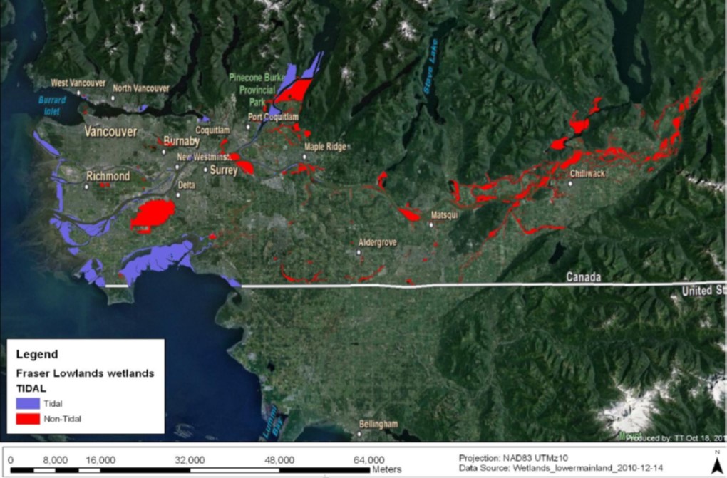 Example of wetland loss in valley bottom/urban area. Map of wetland loss in the Fraser Valley, B.C. since the early 1800s. Blue is where wetlands used to exist on the land, while red and purple are what remain.