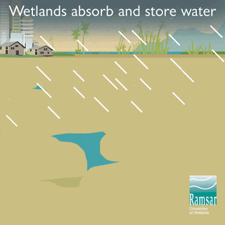 • Preventing major flood events. Wetlands act as sponges on the landscape to provide water regulation. During storms and heavy rainfall, wetlands slow the movement of storm waters by absorbing excess water. They take in rain and snowmelt during wet seasons and then release this stored water during drier seasons.