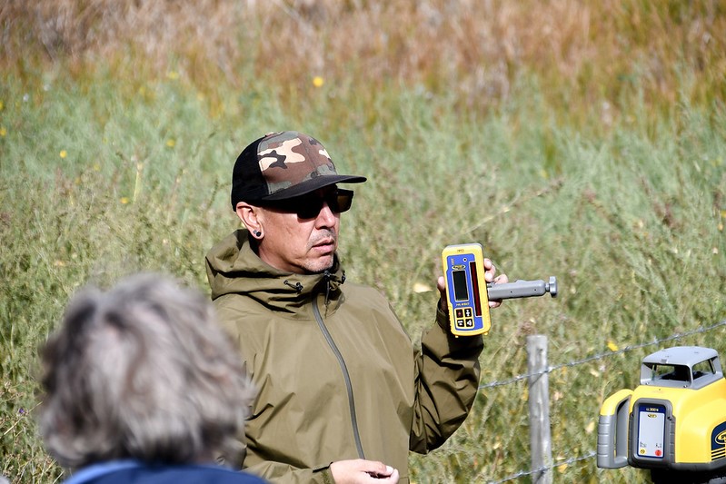 Norm Allard from the Lower Kootenay Band teaches Wetlands Institute participants how to use the laser level. Photo by Jamie Long, BCWF Conservation Stewardship Communications Coordinator.