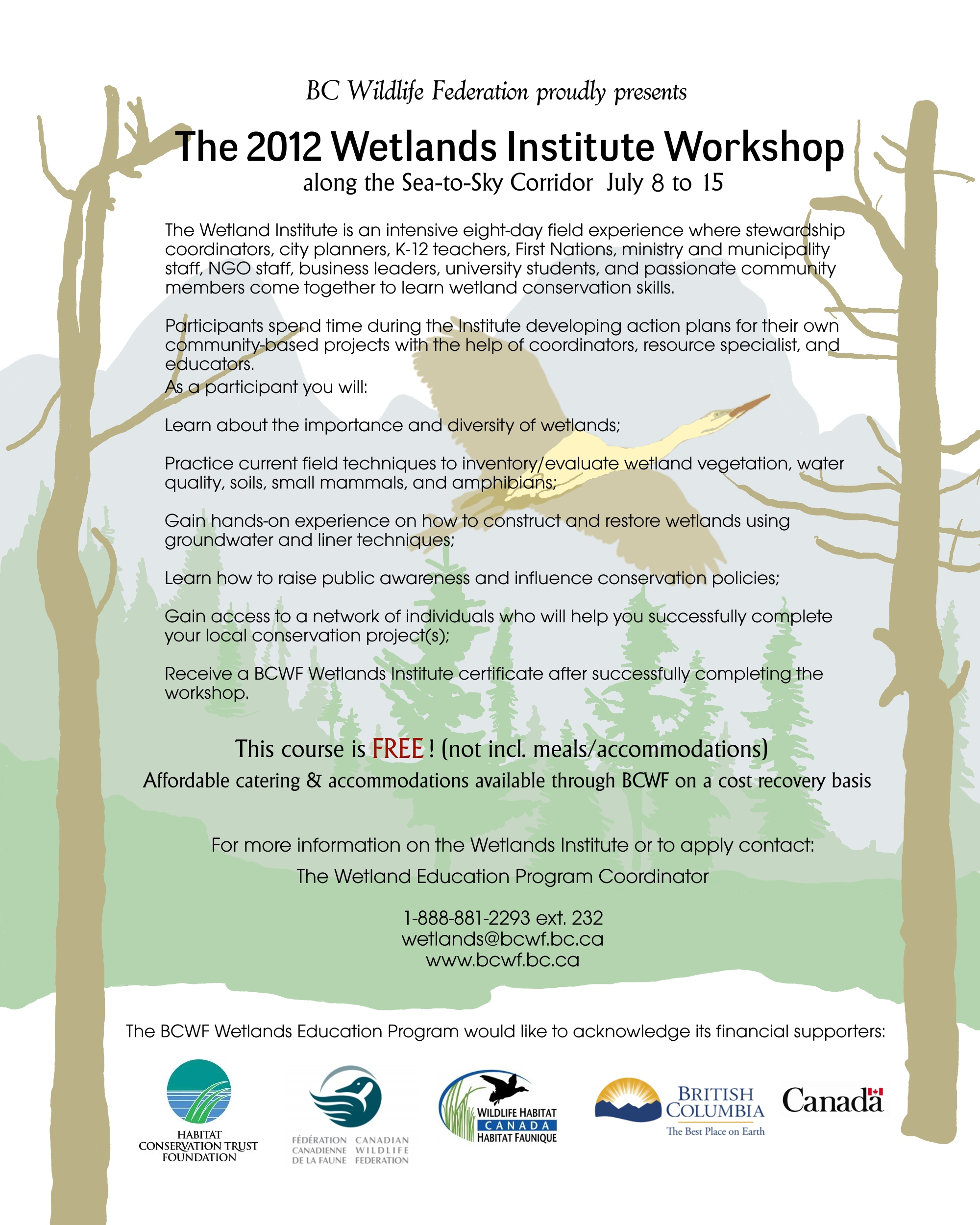 The BCWF Wetlands Education Program is excited to announce its 2012 lineup of workshops and courses. These are designed to enable communities throughout British Columbia to engage in citizen science for the appreciation, monitoring, protection and restoration of their local watersheds. See the list below for details on these courses.